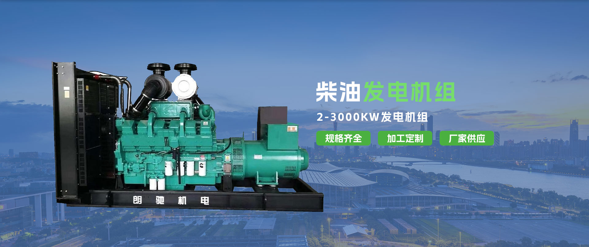 公司生產的2-3000KW柴油發電機組是以世界名牌柴油機:康明斯CUMMINS、德國MTU、DEUTZ、DEERE、韓國、DAEWOO以及國內名牌油機:上柴、濰柴、玉柴、濟柴、香康等為動力,配套英國斯坦福、美國馬拉松、德國西門子及中國知名品牌發電機使朗馳發電機組具備了國際先進水準和品質性能。